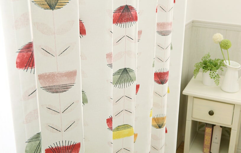 レ—ヴ 〜トルぺ〜 レッド 【撮影カーテン仕様】ヒダ数:標準1.5倍ヒダ(2つ山) 北欧風2級遮光カーテン「トルぺ」 花柄を遊び心あるタッチで表現した2級遮光カーテン「トルぺ」。